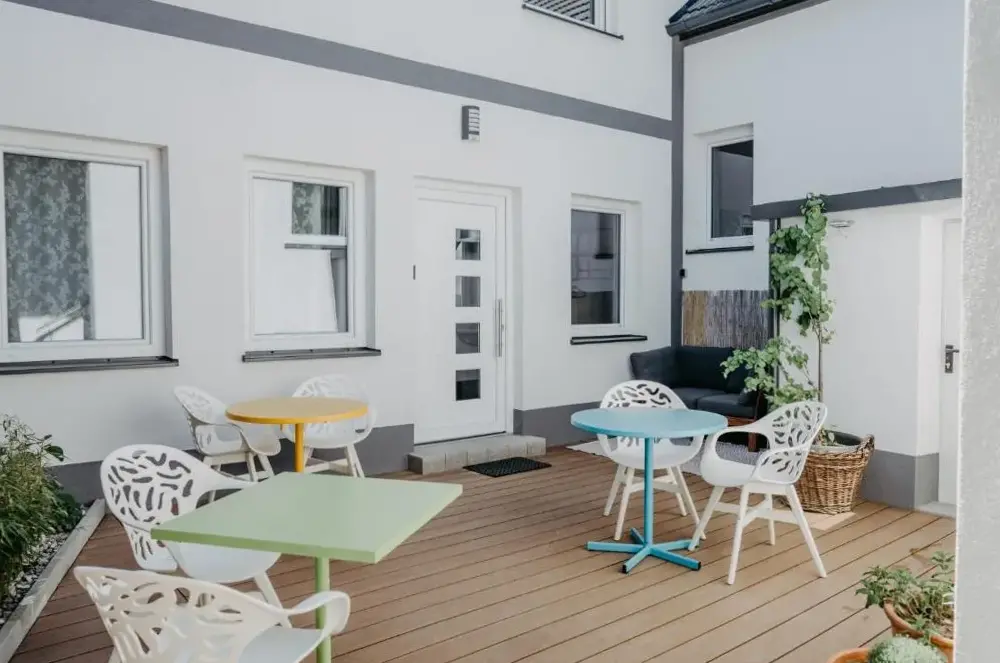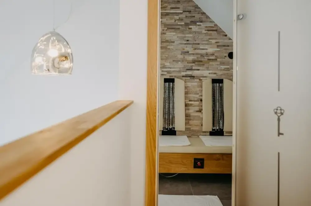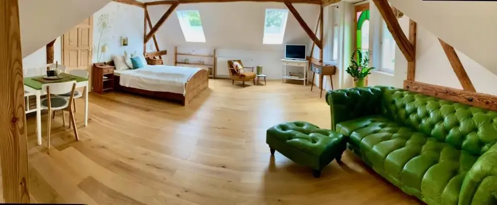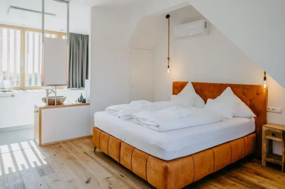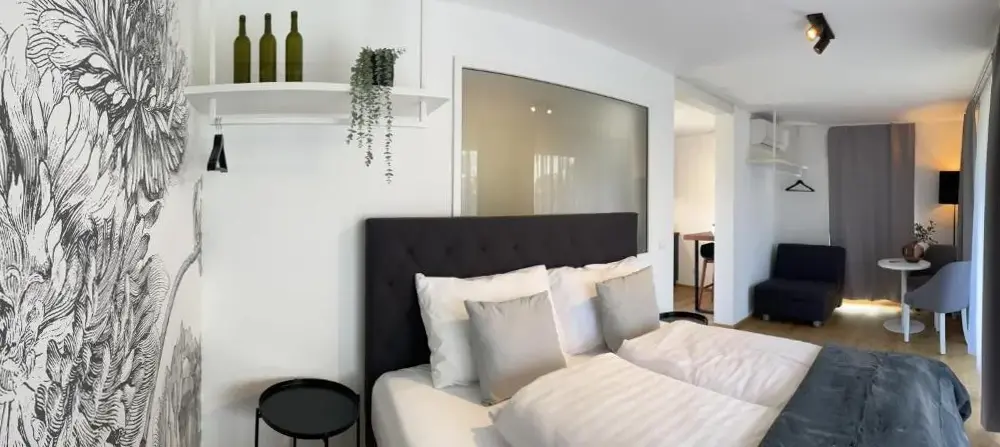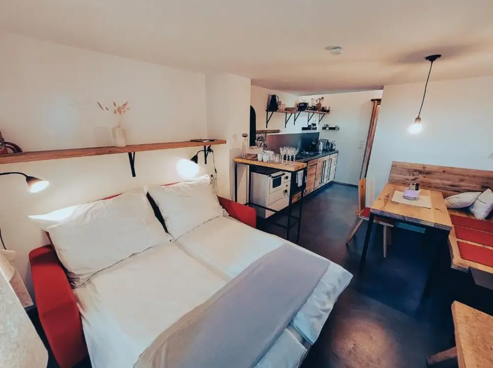 关于 KRACHER Familienapartment Landhaus No 4 的更多信息位于奥地利雷尼茨(Rechnitz)的Weingut Straka,坐落在15号火车站大街,周边环境安静舒适。酒庄兼客栈融合了现代设计与温馨乡村风格,室内装饰考究、色彩协调,木质家具和软装搭配得当,既不失时尚感又充满暖意。每间房间都备有独立茶水机,可随时泡上一杯咖啡或红茶休憩。床铺宽敞且无拘束感,窗帘加卷帘结合使用确保黑暗度极佳,让您睡眠更加沉浸放松。卫生间空间宽敞明亮,镜子带采暖功能避免起雾问题;此外还有专用停车场供住客使用。院子里有一处小型休闲角落及桌椅座位区域(附烟灰缸),适合轻松聚会或独享清凉。酒庄自产葡萄酒品质优良,《Tuto Gas》系列气泡酒口碑颇好——部分游客还购回作为纪念品尝鲜。距离附近景点如伊森沃朗博物馆(10公里)、古堡群(布尔格·施林特、洛肯豪斯)以及滑雪索道(最远31公里)均在方便驾车范围内,维也纳国际机场则需开车约87分钟到达。雷尼茨本地餐厅Basiscafé